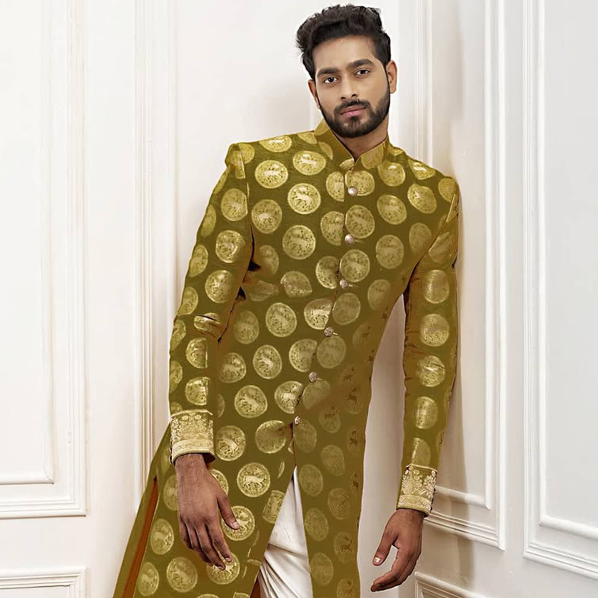 Components: 3(Sherwani, Red and Gold Kanchi Pattu Dhoti, Kandwa)