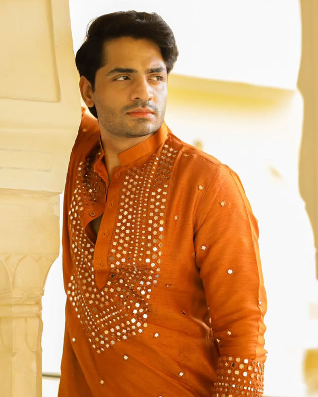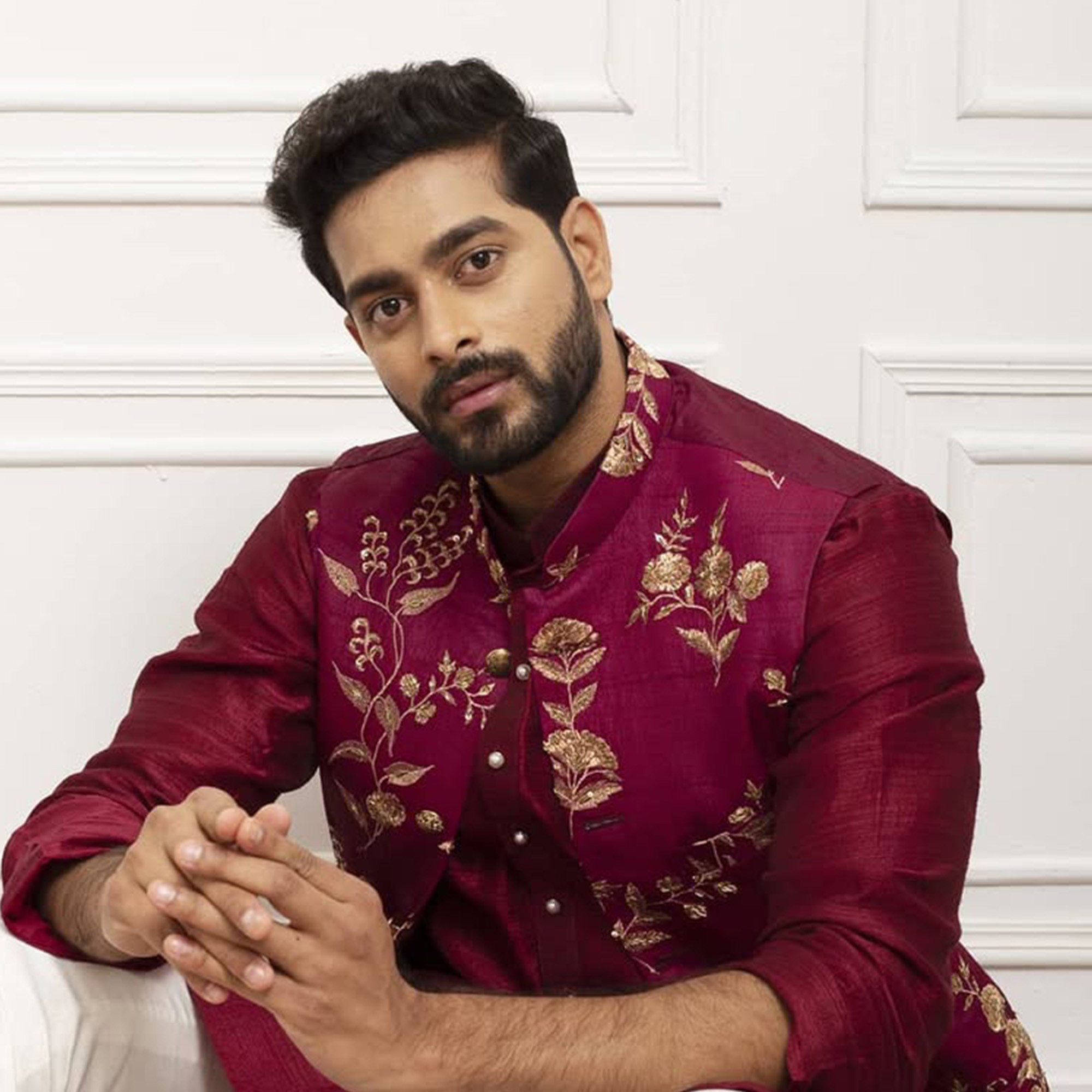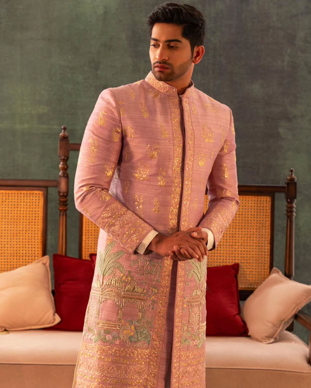 Components: 3(Sherwani, Red and Gold Kanchi Pattu Dhoti, Kandwa)