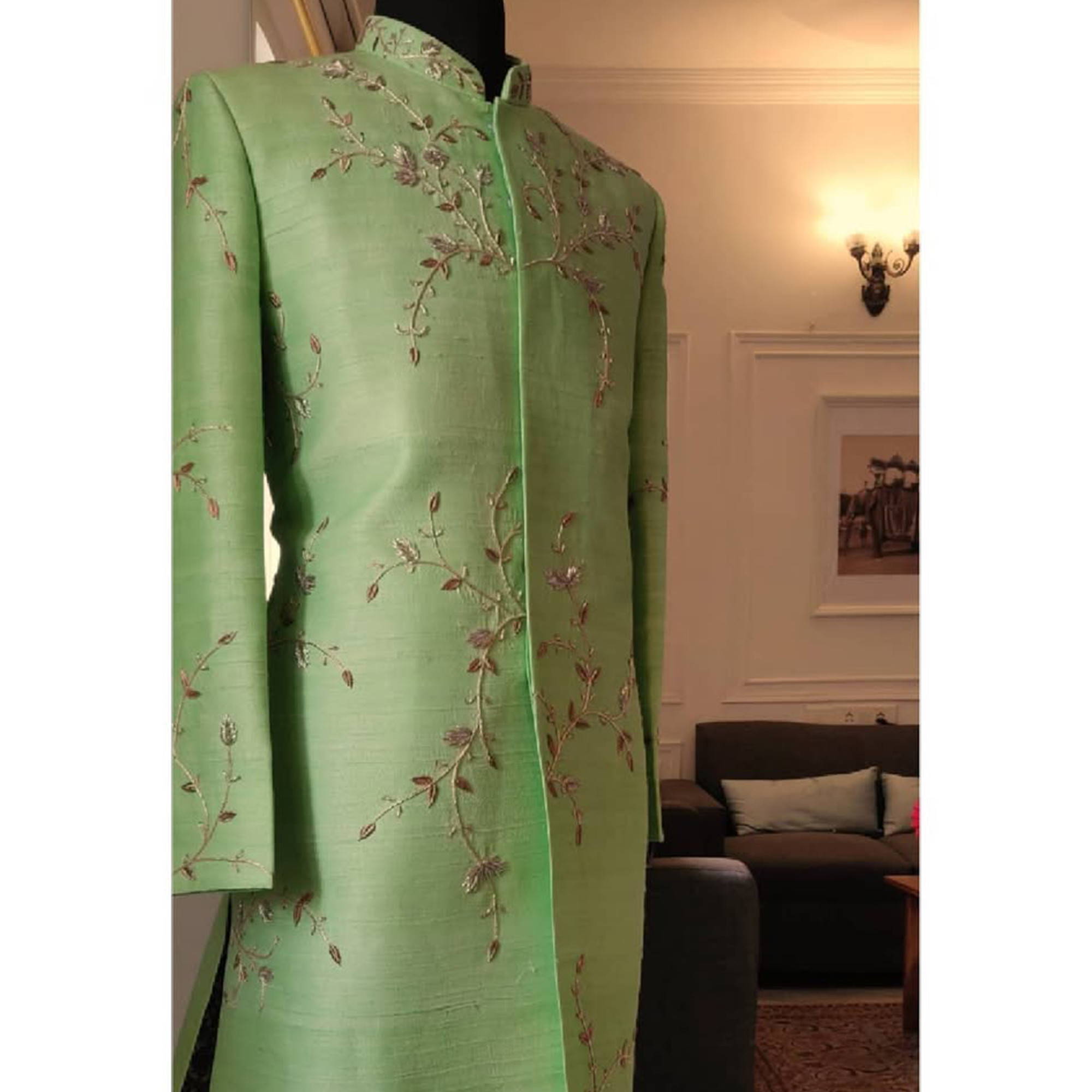 Aham presents Avacado green raw silk Sherwani Embroidered with zari, dabka, nakshi, and glass beads.