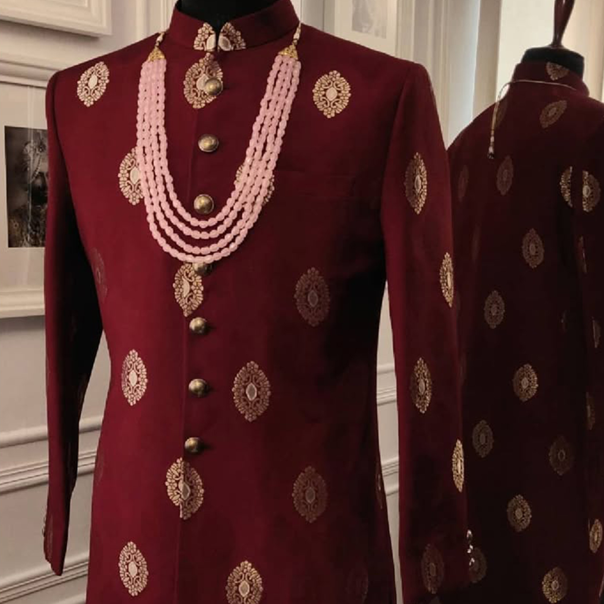 Wine Banarasi Brocade Silk Sherwani with Brass Antique Gold Buttons