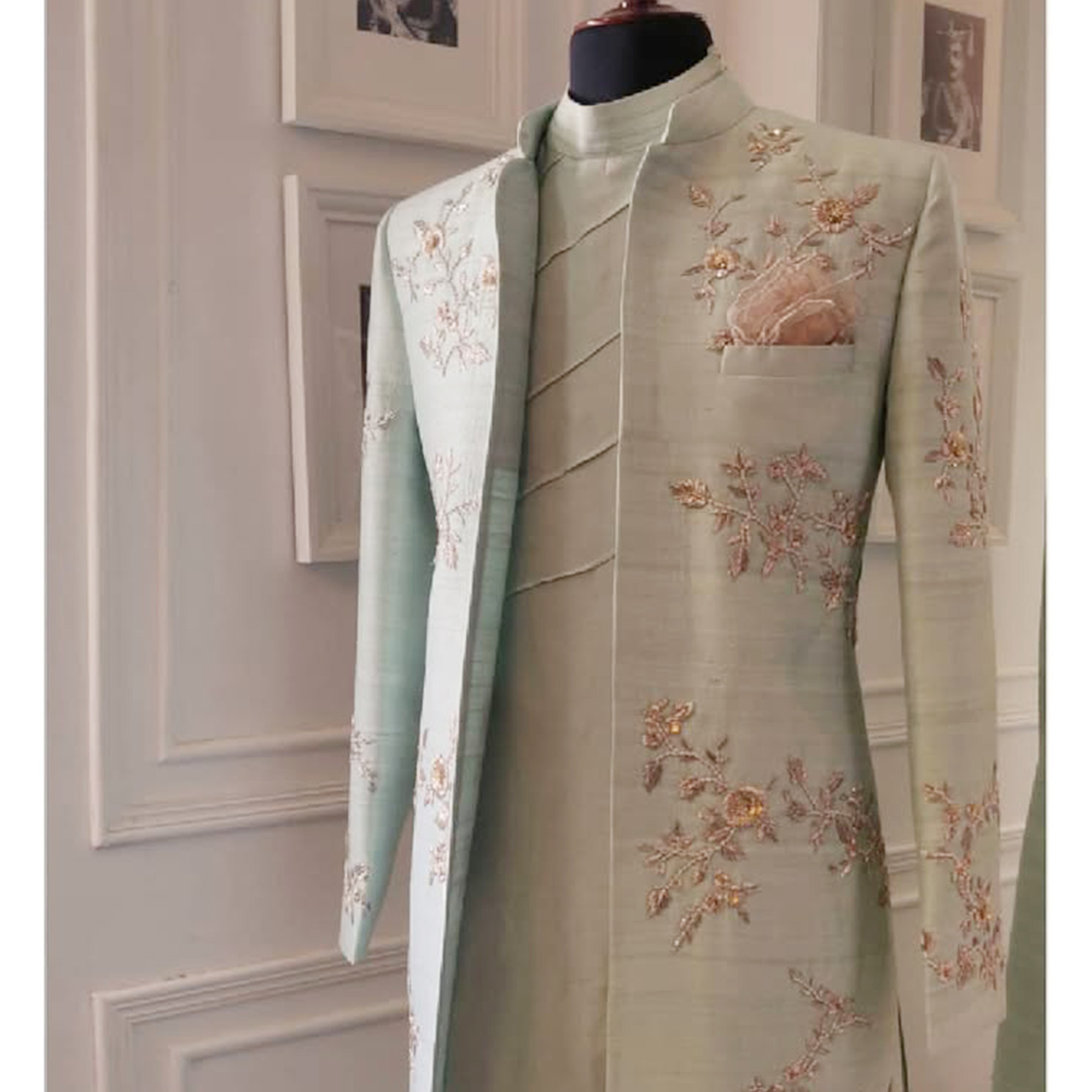 Dull Sea Green Raw Silk Sherwani with Saadi, Nakshi, and Pearl Embroidery in Flower Motifs