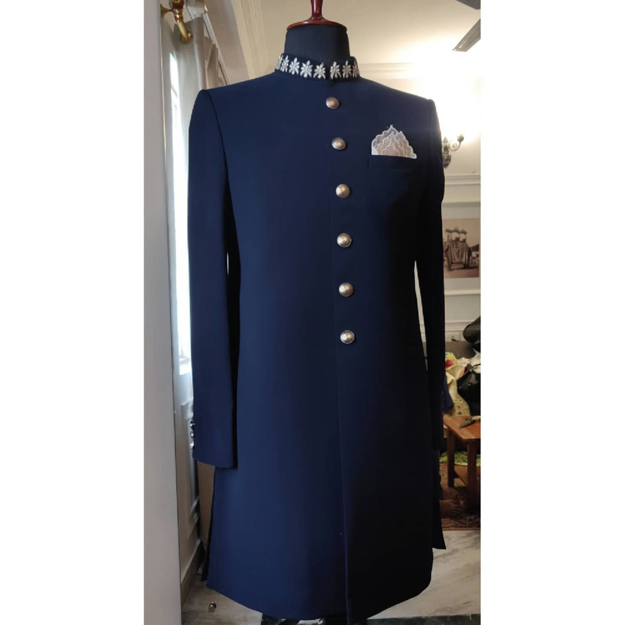 Ink Blue Sherwani with Zardozi Embroidered Collar and Antique Gold Brass Buttons